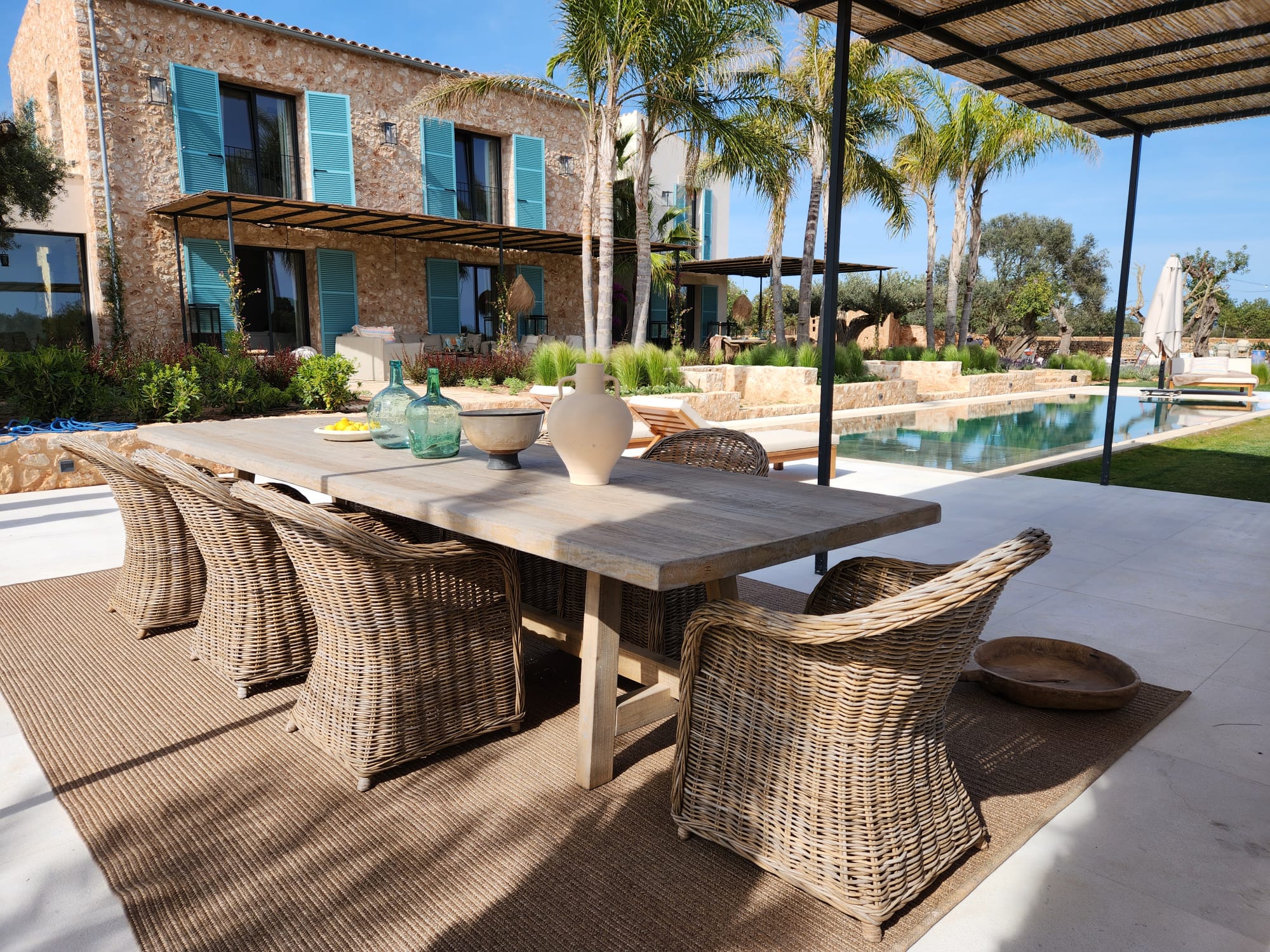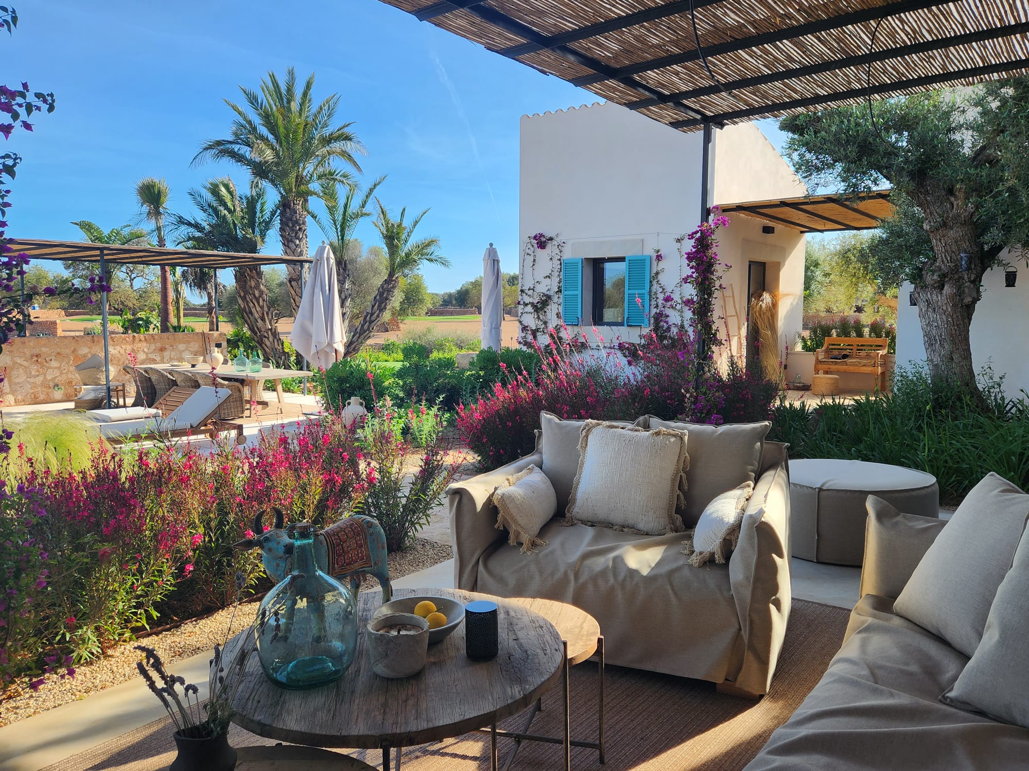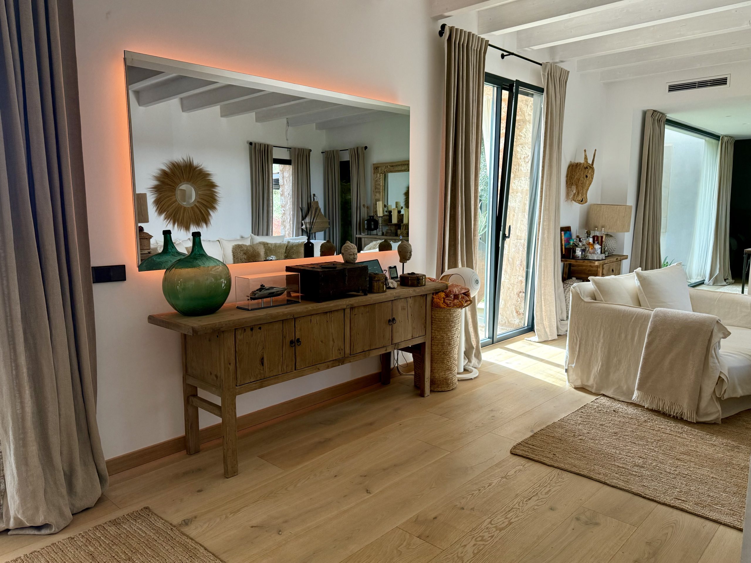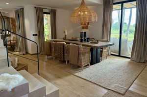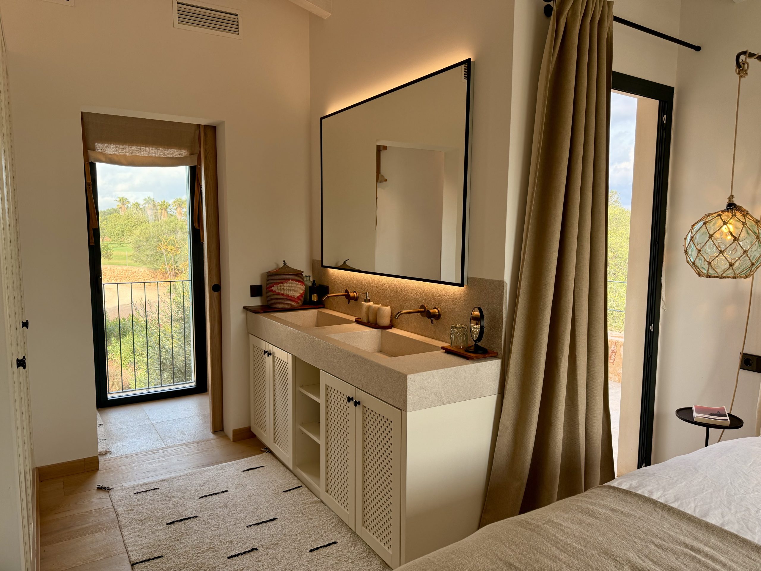 The outdoor areas have been masterfully designed by one of Mallorca’s leading landscape architects. The gardens feature a harmonious mix of Mediterranean and tropical planting, shaded seating areas, fruit orchards, vegetable gardens with automated irrigation, and curated spaces for relaxation. A heated infinity pool, pétanque court, fire pit, and multiple chill-out zones create a sanctuary of leisure and calm.