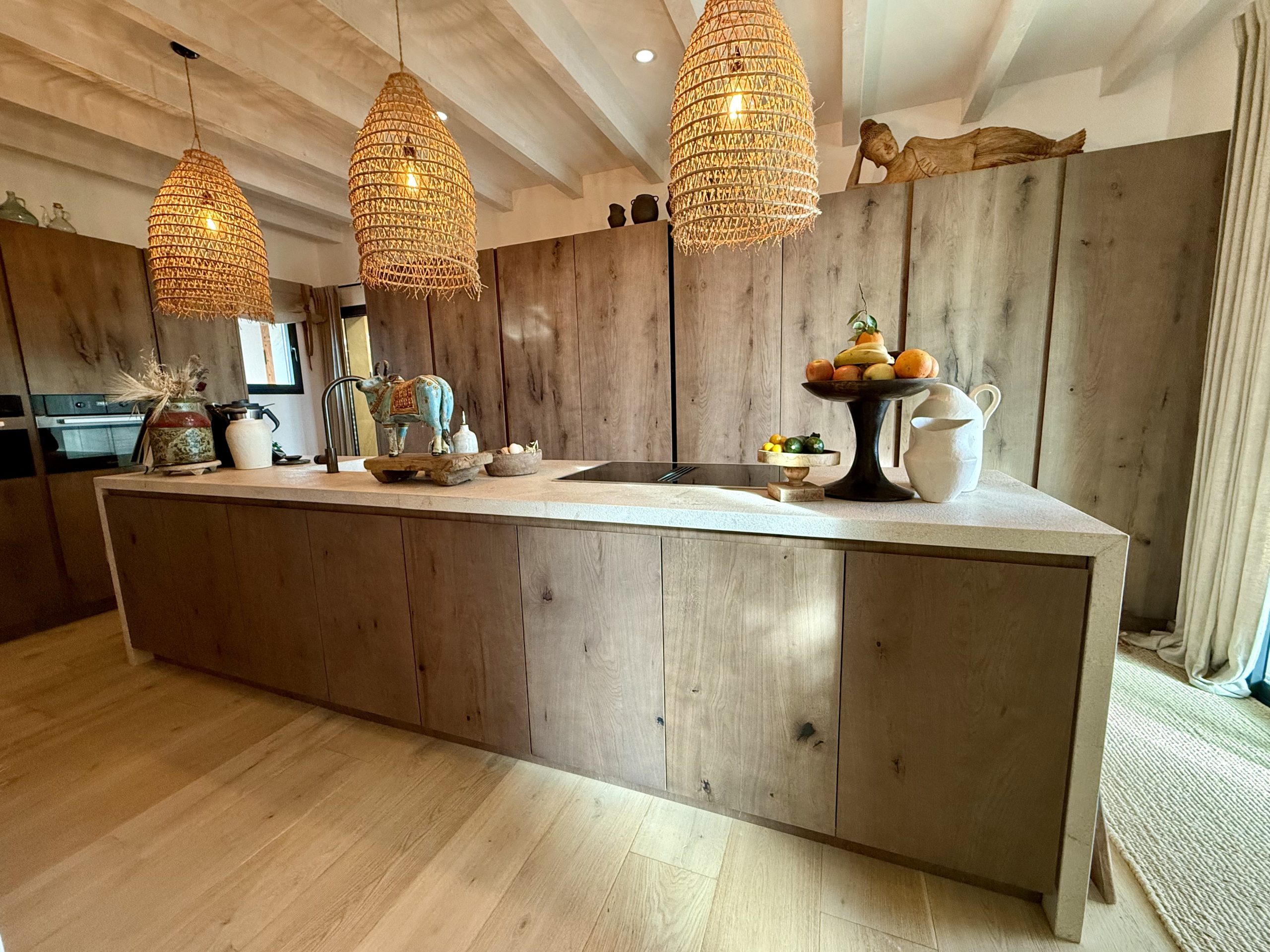 The heart of the home is the elegant open-plan living and dining area, flowing seamlessly onto multiple terraces. A state-of-the-art designer kitchen with a central island connects directly to the outdoor dining spaces—perfect for long meals, gatherings with friends, and relaxed Mediterranean evenings. The luxurious master suite offers a walk-in wardrobe, spa-style bathroom, and a serene outdoor shower surrounded by nature.